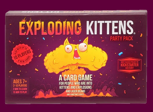 Exploding Kittens: Party Pack Edition is a highly-strategic, kitty powered version of Russian Roulette that can support up to 10 players. Players draw cards until somebody draws an Exploding Kitten, at which point they explode and are out of the game. To avoid exploding, they can defuse the kitten with a laser pointer or catnip sandwich, OR use powerful action cards to move or avoid the Exploding Kitten. Betray your friends. Try not to explode. The last player left alive wins.